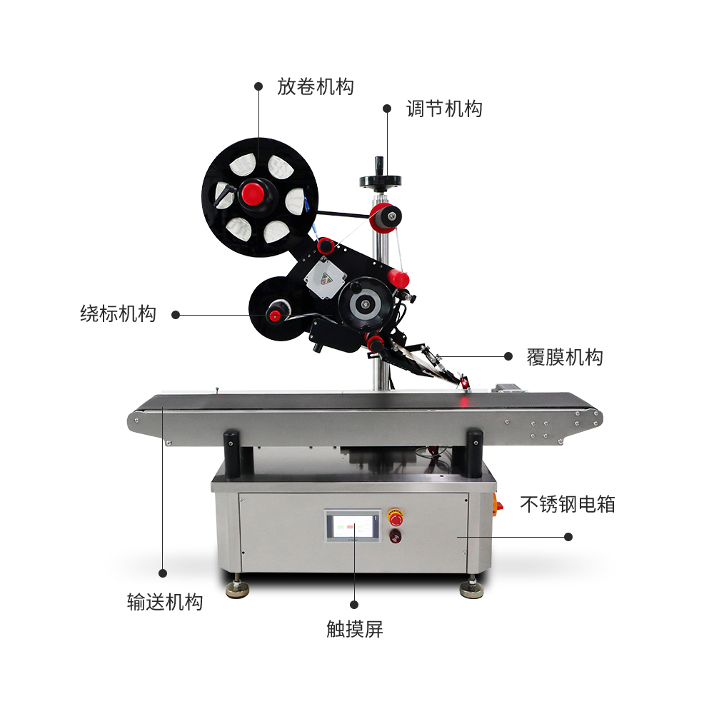 適用于在各種物品的上平面貼標簽或不干膠膜,如書本、文件夾、盒子、紙箱等,更換覆標機構可適用于不平整表面貼標,廣泛應用于大件產品的平面貼標,規格范圍大的平面類物體貼標。